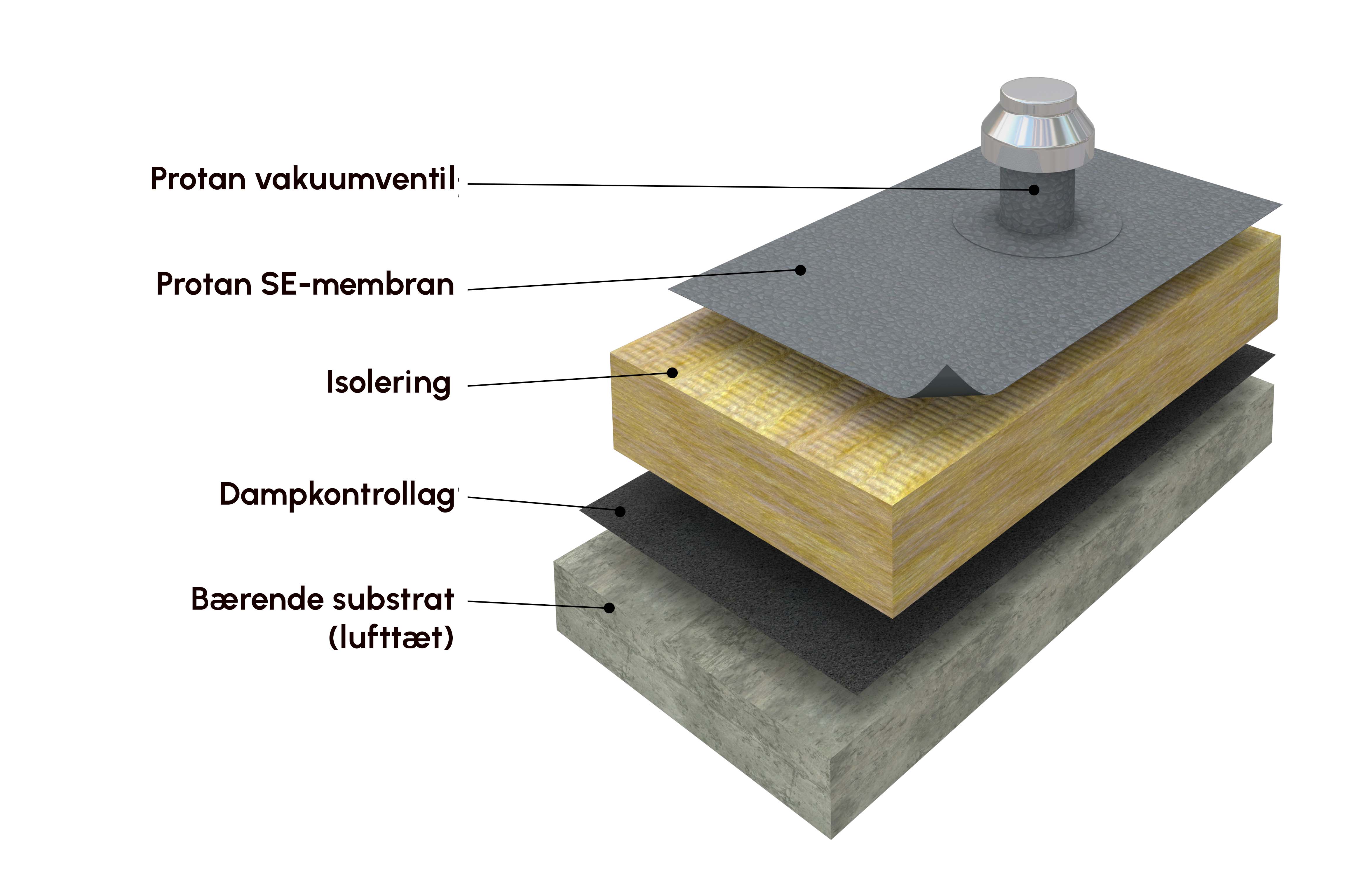 Ideelt er isoleringen løslagte mineralske træplader, men andre typer isolering kan installeres i kombination med mineralsk træ. Lokationen og antallet af Protan vakuumventiler beregnes af Protans tekniske serviceafdeling.