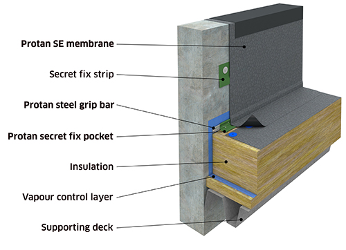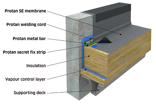 Protan kræver, at membranen ved overgangen mellem tagfladen og brystværnet fastgøres lineært. Vores stålstang giver en god lufttætning og lineær retention, samt reducerer risikoen for punktbelastning ved svejsninger og fastgørelser. Styrken og stivheden af stangen sikrer, at vandrette og lodrette kræfter i tagdækningen overføres til den som en jævnt fordelt belastning. Vi accepterer flere tekniske løsninger til brystfæstelse, men Protans godkendte stålstænger skal bruges sammen med dem alle.
